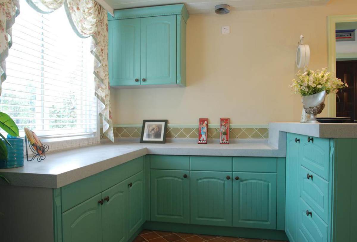 暖而像水一樣透明的陽光灑在清新綠為底色的廚房間,仿佛置身田園,歡快而溫馨。運用了膜壓的工藝。